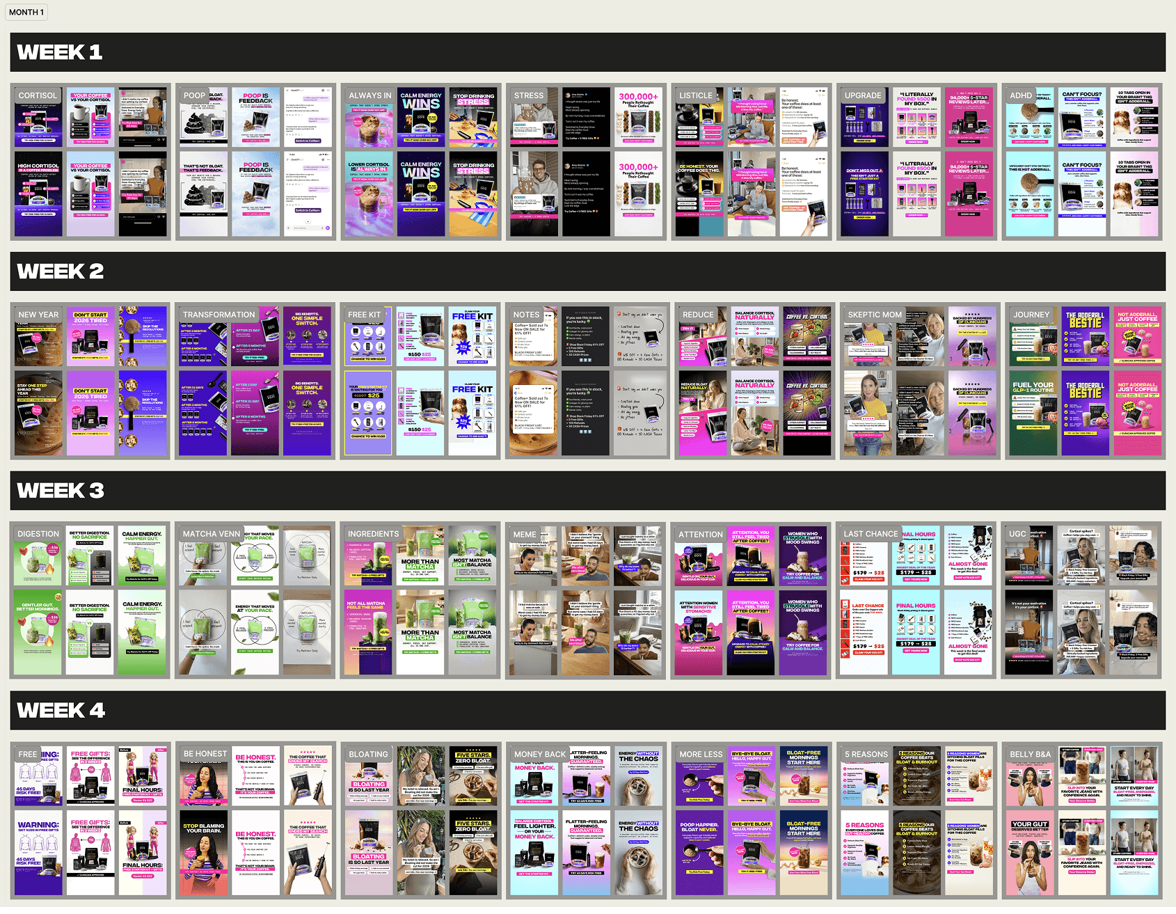 28 strategic batches organized by angle and delivered weekly. This is the system that eliminates creative bottlenecks.
